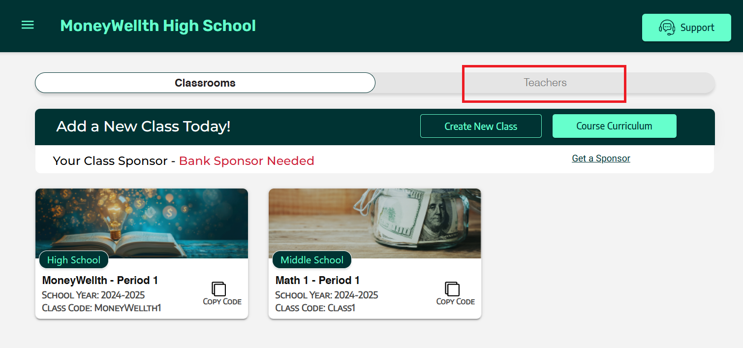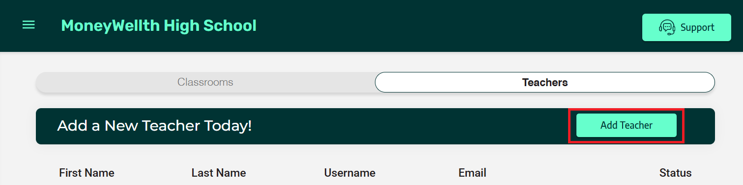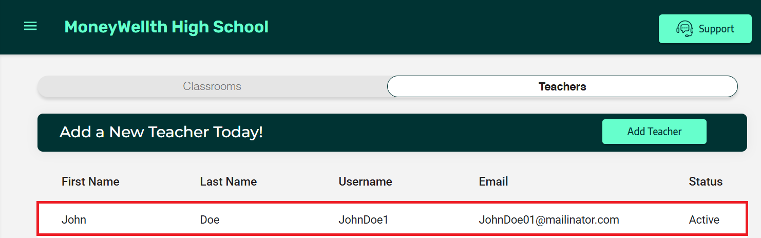 - Your new teacher has been successfully added. They will receive a welcome email to register their Teacher MoneyWellth Learning+ Admin account. You can now assign this teacher to your classroom(s) or have them create their own.