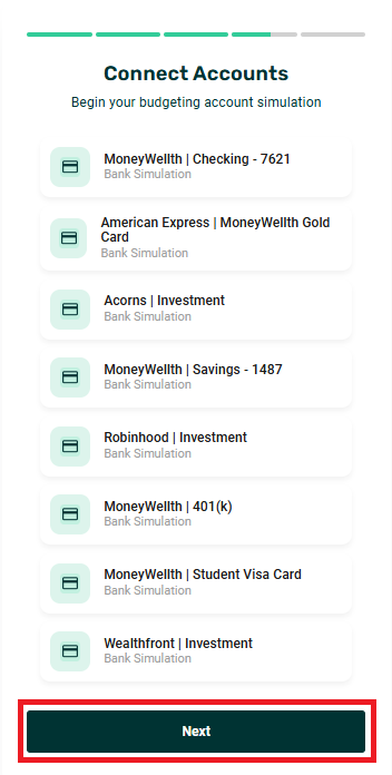 To get started with MoneyWellth Learning+, link the sample accounts to simulate real banking interactions. Once that’s complete, you’ll set your monthly budget and define your personal motivation to guide your financial goals. This process provides hands-on experience in managing finances and building strong habits for the future.
